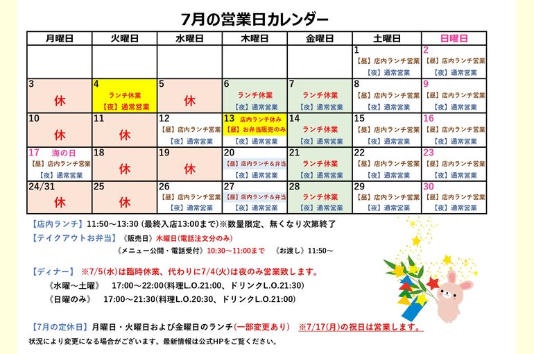 7/17(月)は祝日のため通常営業、7/18(火)7/19(水)は店休日