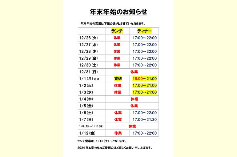 | 1/12(金) | 休業 | 17:00~22:00 |